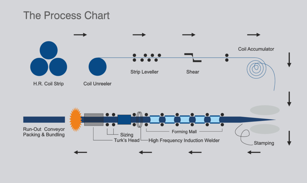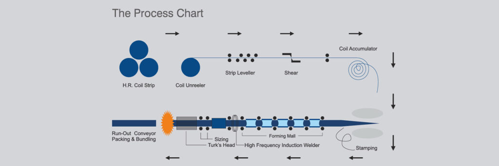 To maintain continuity of production, it is accumulated in an accumulator/loop pit. It is then gradually and continuously formed into a circular shape by shaped rolls as per the required diameter in forming stands arranged in tandem. In the welding stand, edges of formed strip are pre heated by High Frequency Electrical Induction heating process to the desired temperature, which are mechanically pressed together horizontally to form continuous weld seam. This welding process does not need any filler metal. Instead, the welding pressure causes some of the metal to be squeezed from the joint, forming a bead of metal on inside and outside of the tube. This bead or welding flash is trimmed during the process. The weld seam is examined and adjusted as per the weld parameters, including temperature and outside diameters. As per customer’s specification by induction heating process, to get fine grain structure in weld area. It is then cooled in open air followed by water quenching. Subsequently pipe string passes through sizing stands to obtain perfect roundness and diameter. Then pipes are cut to the desired length as per customer’s requirement on cutting car.